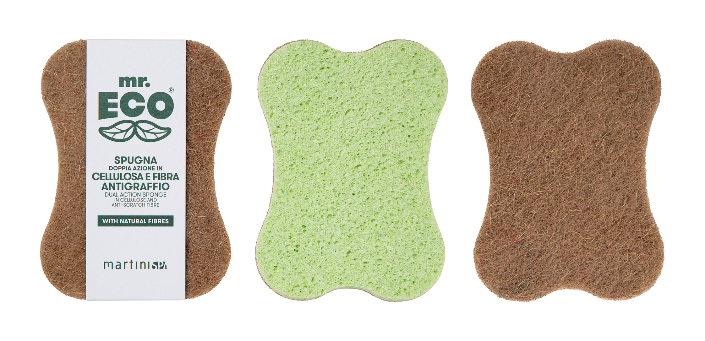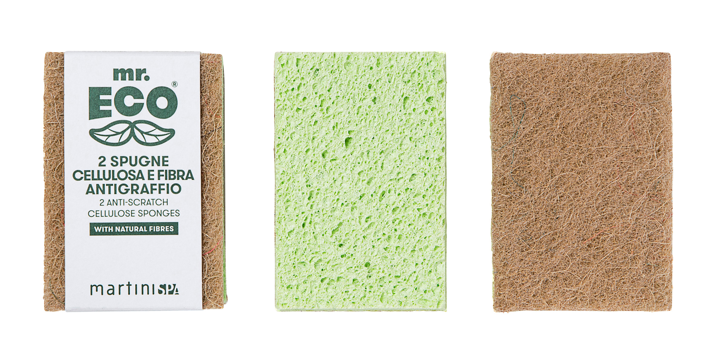 This is the new range of eco-sustainable products designed in Italy for cleaning and maintaining the home: sponges made of vegetable cellulose, sponges made of loofah (loofah) and natural fibres, antibacterial scouring balls made of copper and stainless steel , wooden dish brushes with sisal bristles and bamboo viscose squares, soapy scouring pads.